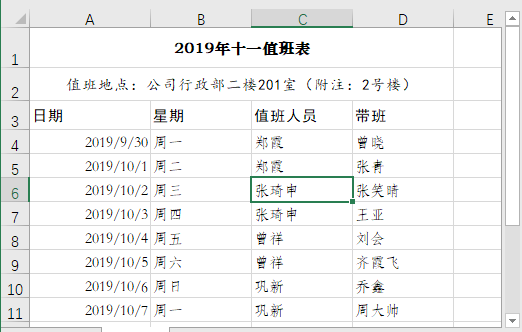 完成公司值班表的内容输入后, 接下来对工作表进行美化, Excel 2019 提供了许多用于美化工作表的格式,利用这些格式,可以使工作表更清晰、形象和美观。