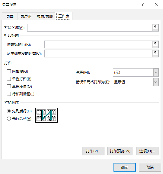 在【工作表】选项卡下设置相关的选项,然后单击【确定】按钮。