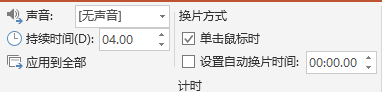 设置幻灯片的切换方式后,可以使演示文稿在放映时按照设置的方式进行切换。切换方式包括【单击鼠标时】和【设置自动换片时间】 这两种(见下图) 。