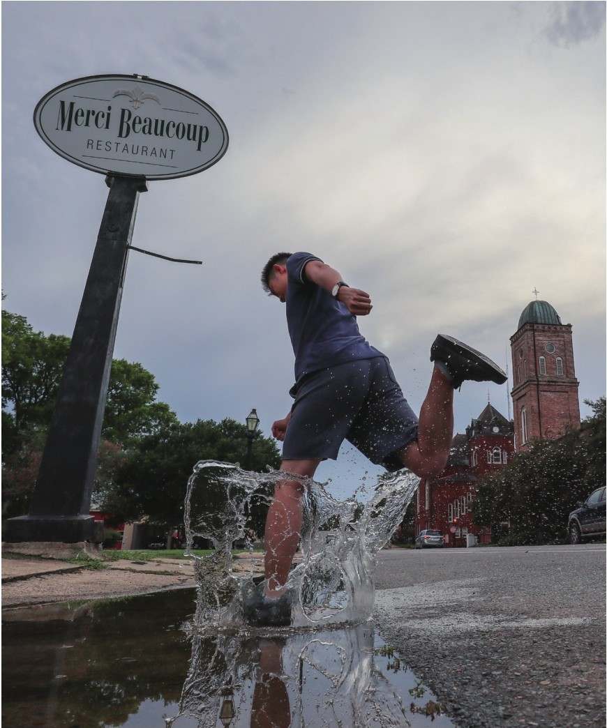 在这张照片中,踩水坑的小伙子被我用高速快门凝固住了,他踩起的每一滴水滴在画面中也都被凝固住了。