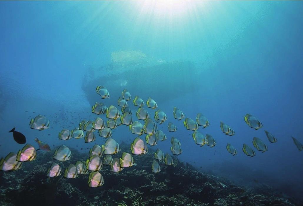 观察,是一名摄影师应有的基本素质,水下摄影也一样。在海里摄影不同于在陆地摄影,海中可参考的物体太少,所以借助海面上的元素进行创作也是一种不错的选择。上页的照片因为巧妙选用了阳光透过海面折射下来的光,以及海面上的船只、海中恰好经过船底的燕鱼,画面有了空间感。